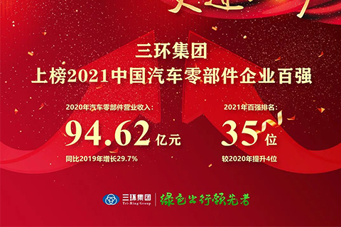 7月12日,2021汽車零部件企業“雙百強”榜單在北京發布。三環集團有限公司以94.62億元(僅2020年汽車零部件版塊營業收入)上榜“2021中國汽車零部件企業百強”第35名,較去年上升4位,在湖北企業中排名第2。